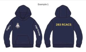 Navy blue with Squadron crest embroidered on the front, 283 RCACS on the back, Flight number on right arm and name on left arm.  Only senior cadets that are retiring this year will have their rank included beside their name.